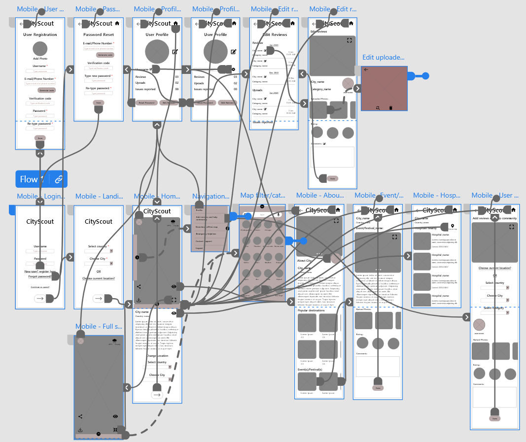 Image- High Fidelity Prototype of CityScout Website with links connecting all the screens